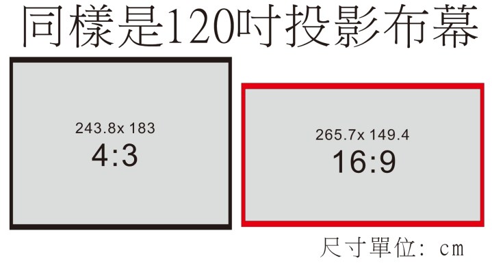 這個顯示比例完全依照投影布幕廠商給的120吋布幕數據所製成