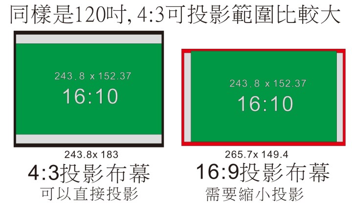 同樣大小的16:10投影畫面,放在4:3跟16:9的投影布幕會有不同的表現!