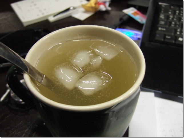 冬蜜…..用溫水稀釋之後,加上冰塊! 其泡出的顏色竟然跟一般的蜂蜜不同,為淡黃金色,不是一般的褐黃色。