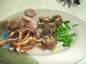 10點到了店家之後,店家就將裝好的卜肉拿給我,份量的確不多,但現場吃的感覺是不錯,肉偏甜,不用胡椒鹽也很好吃。 看到當地人跟遠道而來的朋友一起在店裡點起滷菜來(單粉肝一小份就點了三百以上),我也跟著去點滷菜,點了粉腸、香腸、豬耳朵(粉肝看起來真的很貴@@!剩下的量也不多),還跟切滷菜的婆婆說:『我只有一個人量請少一點。』,於是就拿到一份60元的滷菜! 之後再跟老闆說還要一份『炒青蔥』(NT:100)跟白飯.。過不久店家很熱忱的將菜上來了。(店家態度很好啊! 只是要尊重其店裡的流程與規矩,人家做事方便,所要的服務很快就到位)