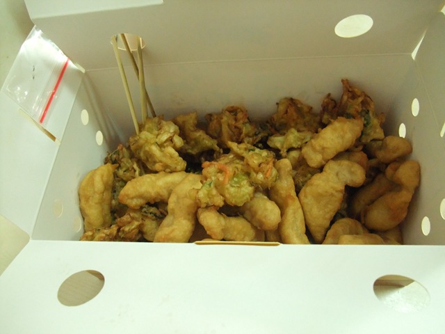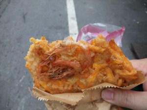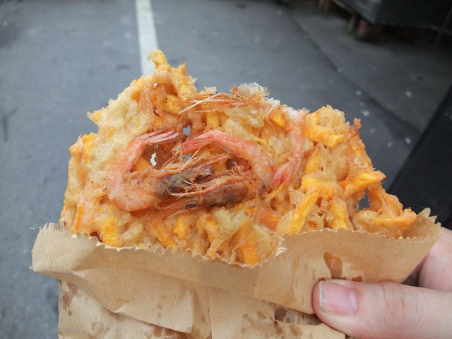路上買的蝦餅,滿滿是蝦跟地瓜啊! 調味料我沾的不夠,不然應該會更好吃!