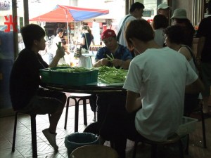已經開店了!店員還在整理蔥!外面就有一家蔥油餅,對面又有一家阿婆蔥油餅!
