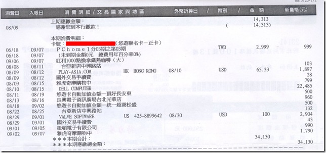 2011年9月帳單, 刷34130, 紅利點數增加1313.![]()