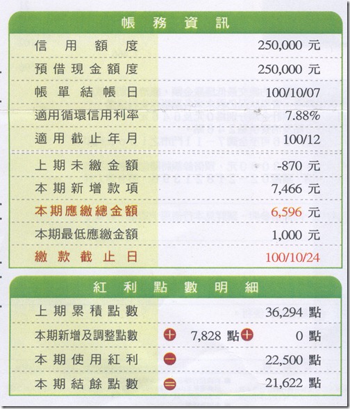 2011年10月帳單, 刷7466, 紅利點數增加7828. (這個月我因為拿到第一銀行商旅鈦金卡, 所以有些消費轉至該卡)