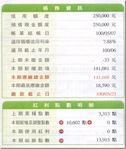 2011年5月帳單, 刷14萬, 紅利點數增加10602.![]()