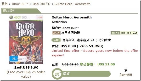 Play-Asia XBOX 360 吉他英雄 史密斯飛船 特價美金8.9, 超便宜!