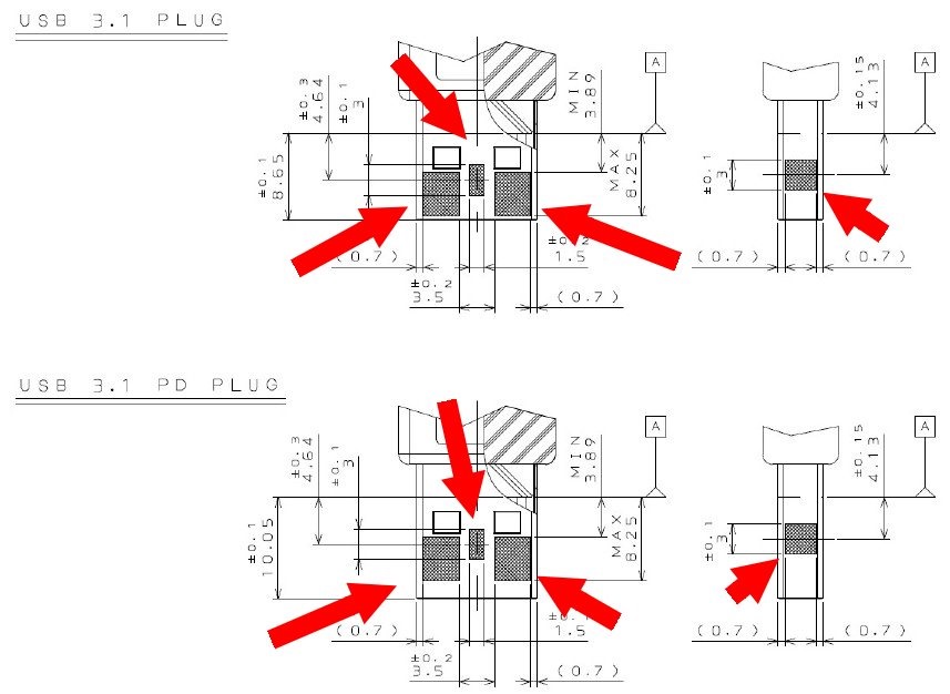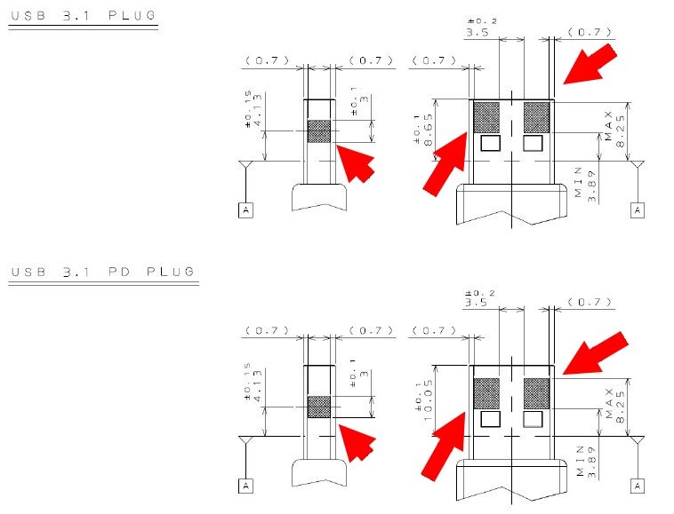 3. USB 3.1 PD Plug 其插頭長度比一般的 usb 3.1 Plug長了1.4(PD:10.05, 一般:8.65). 附註: USB PD: USB Power Delivery(符合USB PD的裝置,可藉由USB PD的電源啟動跟運作。)