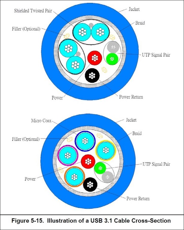 新的cable組成 ,其除了原本的SS/SSP對絞線,多了一種SS/SSP同軸線可選擇。因為要對應10Gbps, 除了SS/SSP線材可能需要採用鍍銀線,而SS/SSP同軸線線材的skew控制在加工段則更加困難,但相對的SS/SSP同軸線的Ground跟遮蔽各自獨立,對於線材加工特性是好是壞,有待驗證。