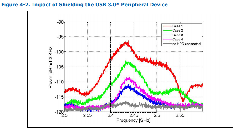 在使用USB 3.0裝置的環境,USB 3.0裝置會產生了高強度的干擾信號,造成2.4 GHz 的無線裝置的信號干擾跟衰減。Intel在實驗中,甚至必須要用整個銅箔去包住『整個USB 3.0裝置』,才能將干擾訊號降到一定程度。