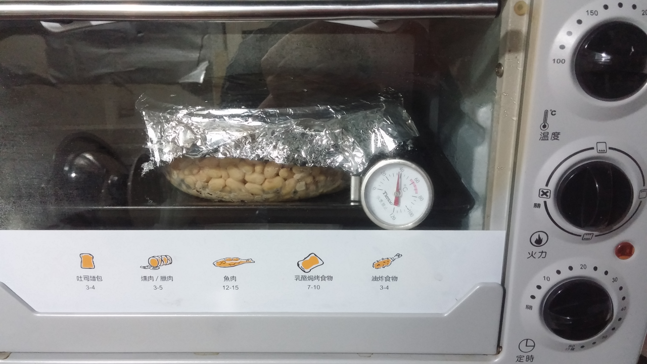 烤盤裝水約一半高度,放進烤箱底層,將已拌好納豆的黃豆玻璃保鮮盒放在『水盤』上,咖啡溫度計的尖端要泡在水中。溫度定100度,上下火,每次溫度計=水溫到達45度之前,就將烤箱關火,其約可保溫35~45度三小時以上,每次重新加熱時,順便開一下烤箱,讓納豆呼吸; 如果沒有溫度計,可以用手摸水,溫溫的即可。