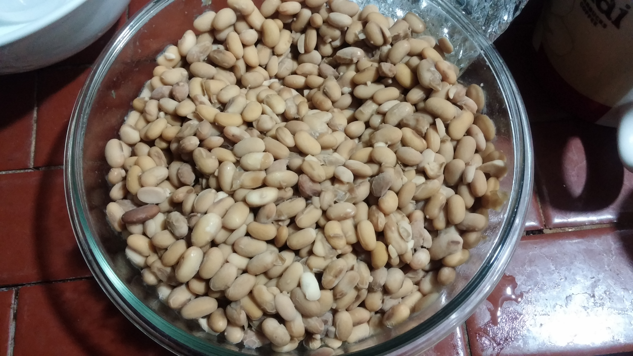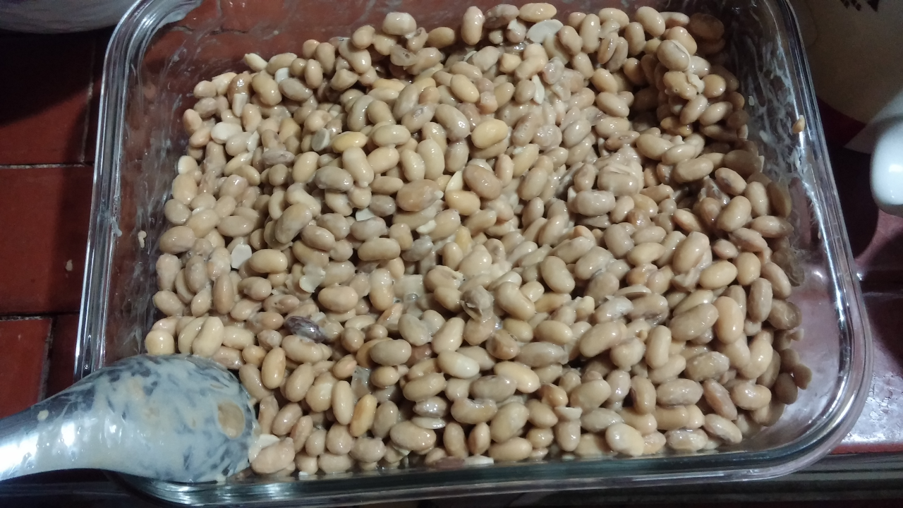 2. 黃豆泡水,先充一下水,挑掉石頭或不好的黃豆。