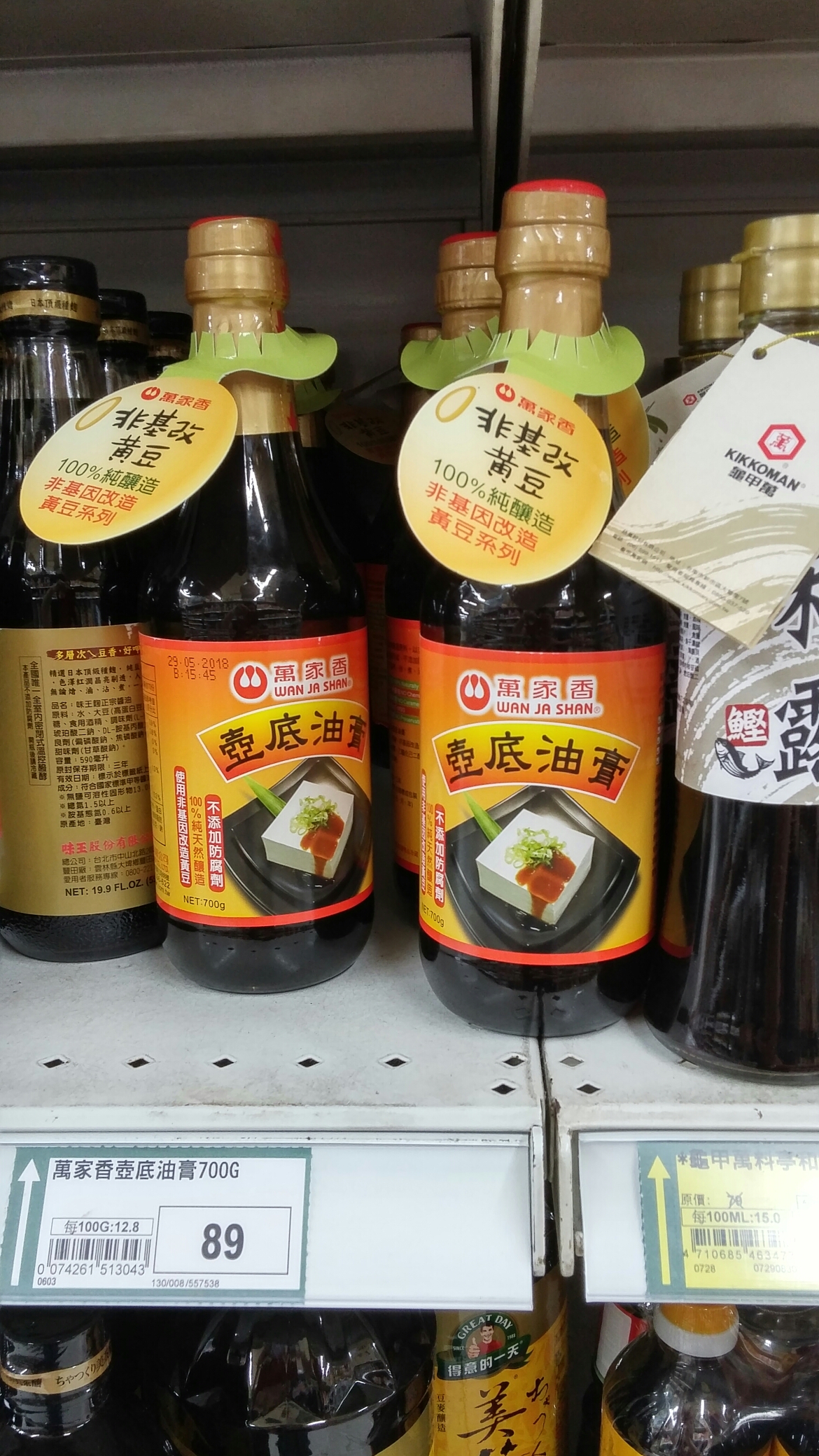 看到萬家香壺底油油膏用玻璃裝瓶以及強調非基改黃豆,心裡有很多感觸。台灣的醬油業的進步看到了!