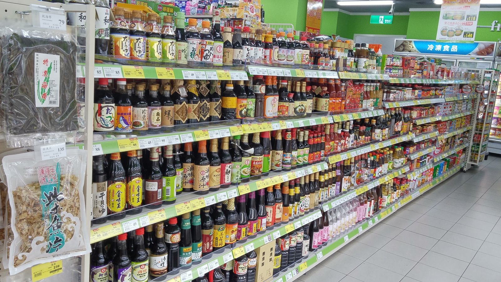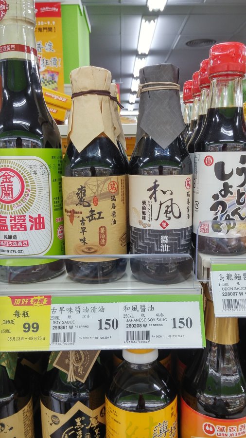 醬油的擺設很夠水準,素蠔油跟蠔油的集中,便宜/大瓶的放下方,最好最貴的放在容易取得且視線集中的第二層,加味醬油、沾麵醬汁、烏龍麵醬油/醬汁,都是分門別類的放好。老實講,對於這擺櫃人員真的要鼓掌鼓勵!