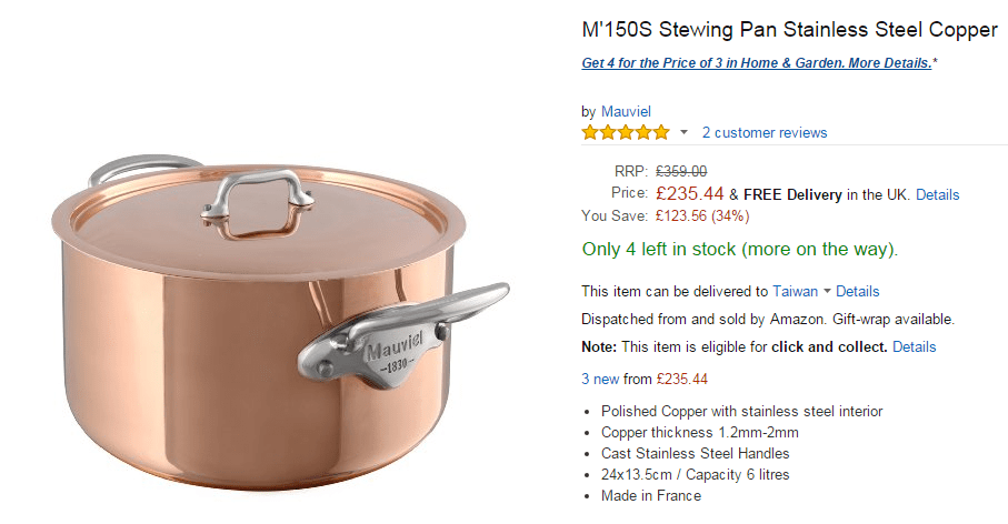 近期由於美國Amazon的Mauviel不怎麼優惠,而且不寄台灣或台灣運費超高,並且我要的湯鍋等了一年,還是沒特價!