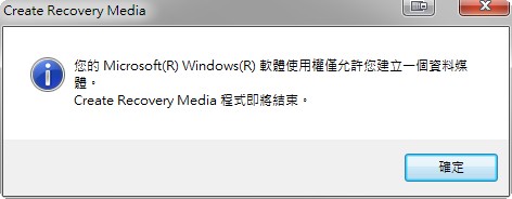 您的Microsoft Windows 軟體使用權僅允許您建立一個資料媒體。Create Recovery Media程式即將結束。