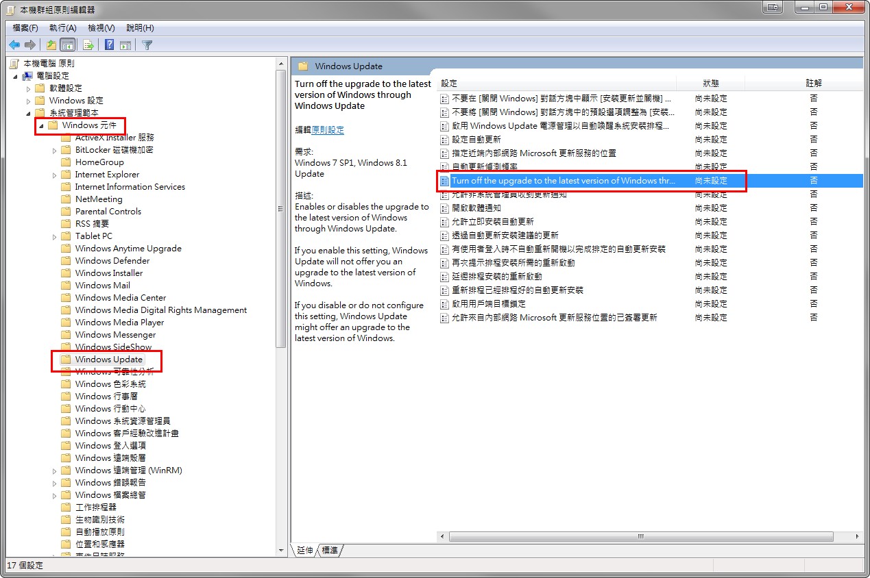 - 叫出『電腦管理』->『系統管理範本』->『Windows 元件』->『Windows Update』,找到『Turn off the upgrade to the latest version of Windows through Windows Update』。(我不知道這個是否就是微軟官方網頁寫的 [關閉透過 Windows Update 升級至最新版的 Windows])