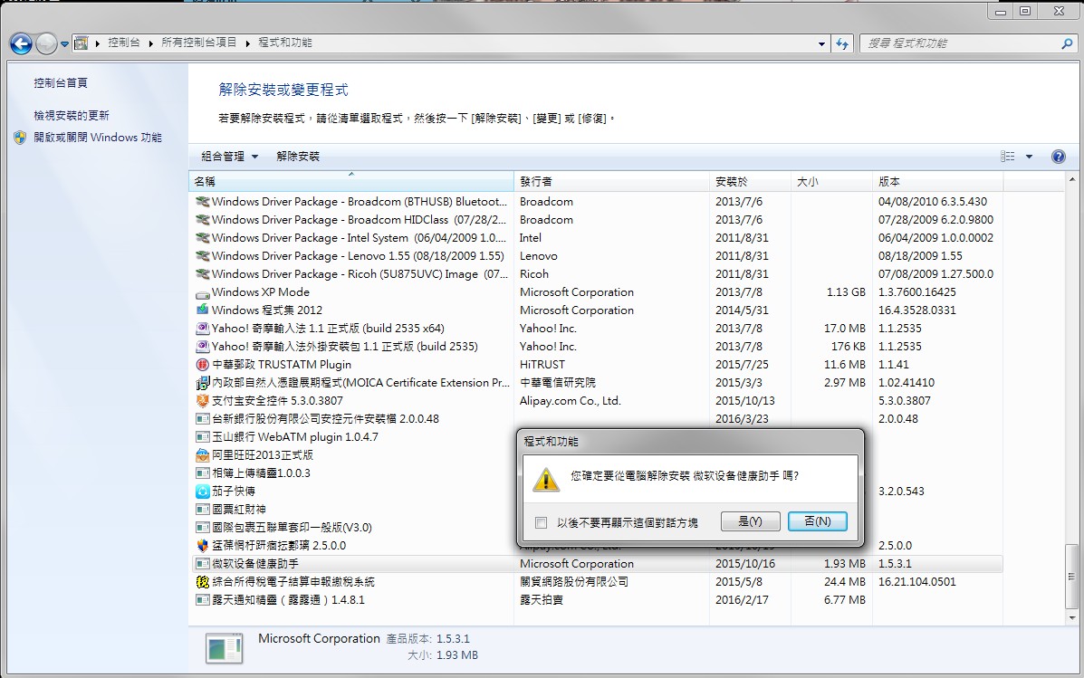 然後到『控制台』->『程式和功能』,找到『微軟設備健康助手』,直接移除掉即可!
