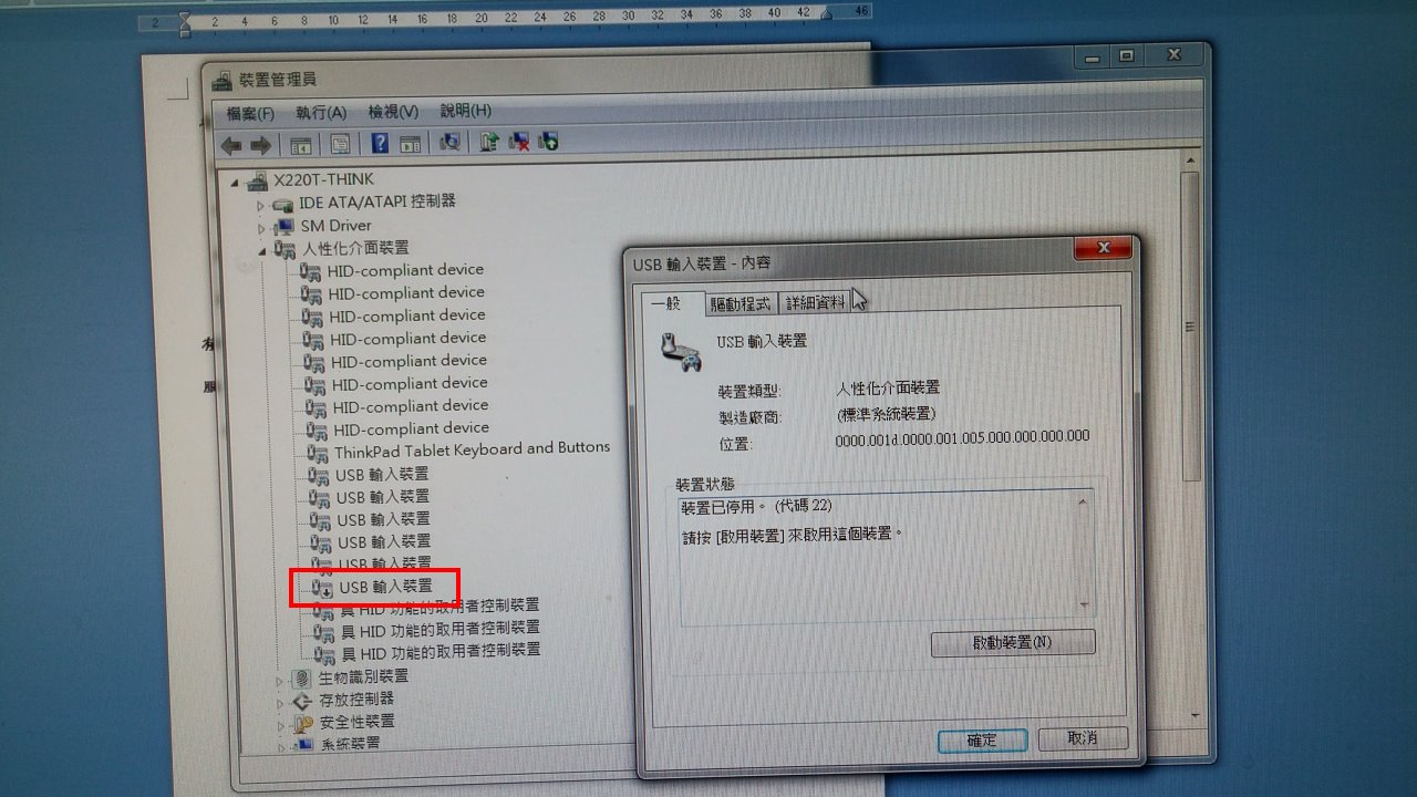關閉最後一個USB 輸入裝置就是X220T的觸控螢幕之觸控裝置