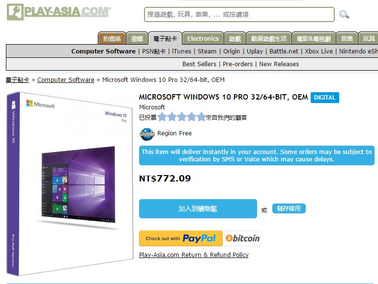 現在可以直接去 Play-Asia的MICROSOFT WINDOWS 10 PRO 32/64-BIT, OEM 購買。