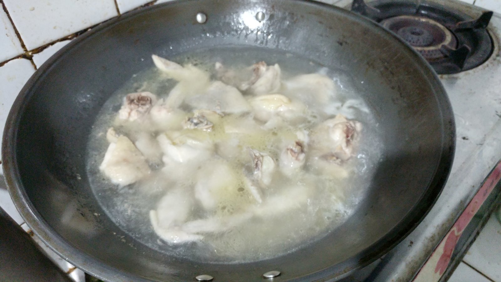 首先先用水川燙雞肉去腥污,建議先從冷水時就丟入雞肉,水面要高過並完全淹過於雞肉,煮到水快滾時(要翻動雞塊),立刻將雞肉撈起丟入冷水,用活水沖洗。原本的快滾的熱水就會留下一堆雞肉的腥臭物質,直接倒掉並清洗鍋具。