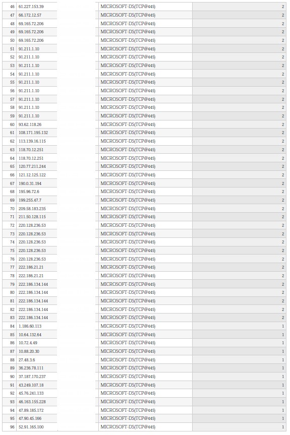 結果單單一天5/13而已,就記錄到下表超多的TCP@445攻擊! 老媽,母親節我沒回家去是對的! 不然我可能只能做到這個月。