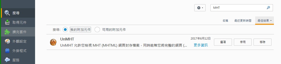 啟動 Firefox,開啟Firefox的附加元件,尋找『擴充套件』的unMHT,並且進行安裝