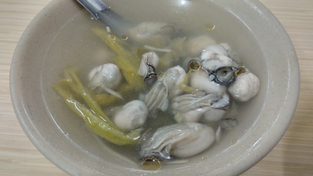 | 布袋東石地區的蚵仔湯都是只有蚵仔、酸菜絲、薑絲、麻油,最多會加點米酒。新鮮的蚵仔燙過不縮水 |