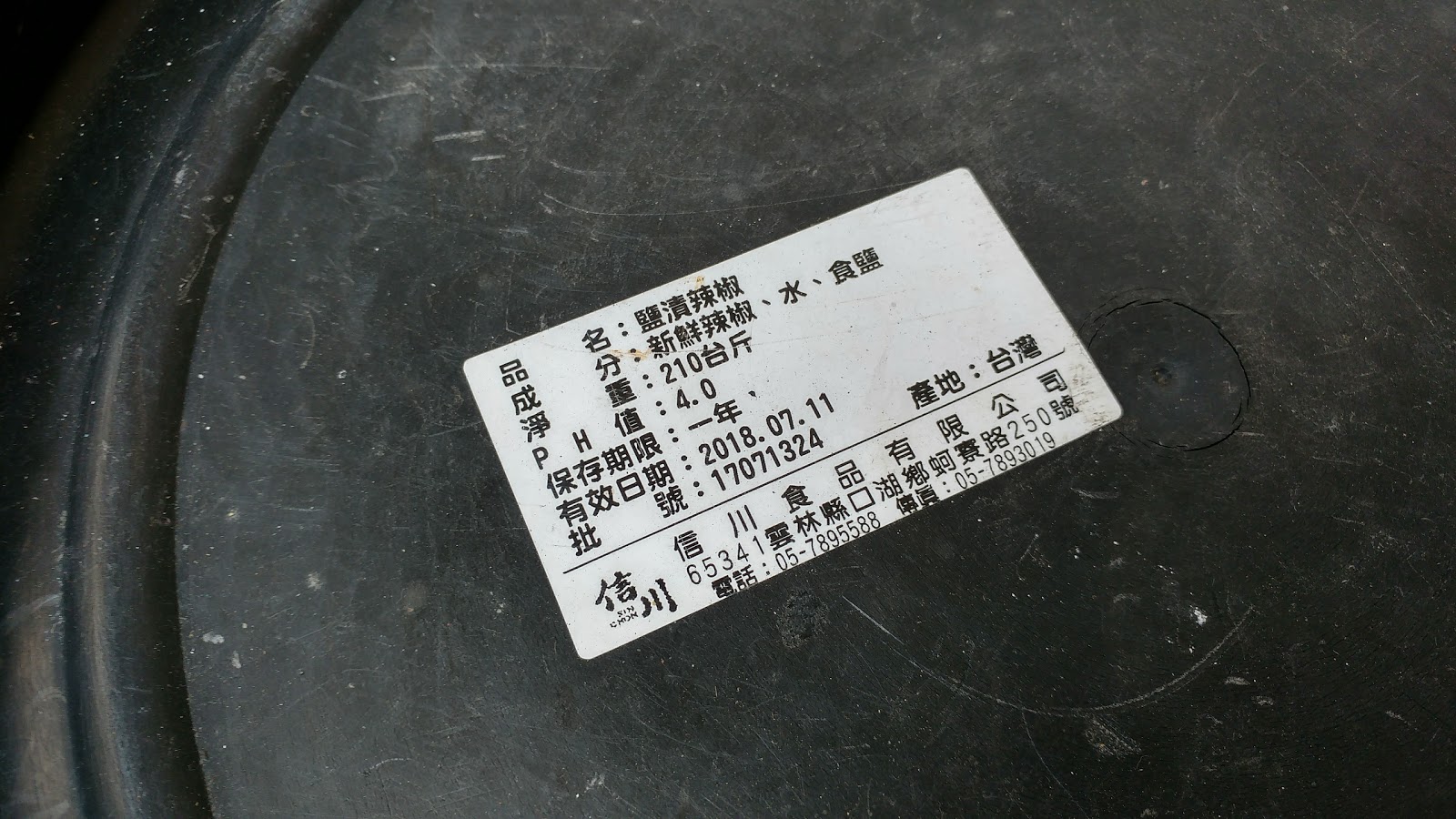 旁邊就放置味台的醬液跟雲林信川鹽漬辣椒的桶子,所以是拿醬液來做加工成醬油跟醬油膏,醃漬辣椒加工後成辣椒醬。