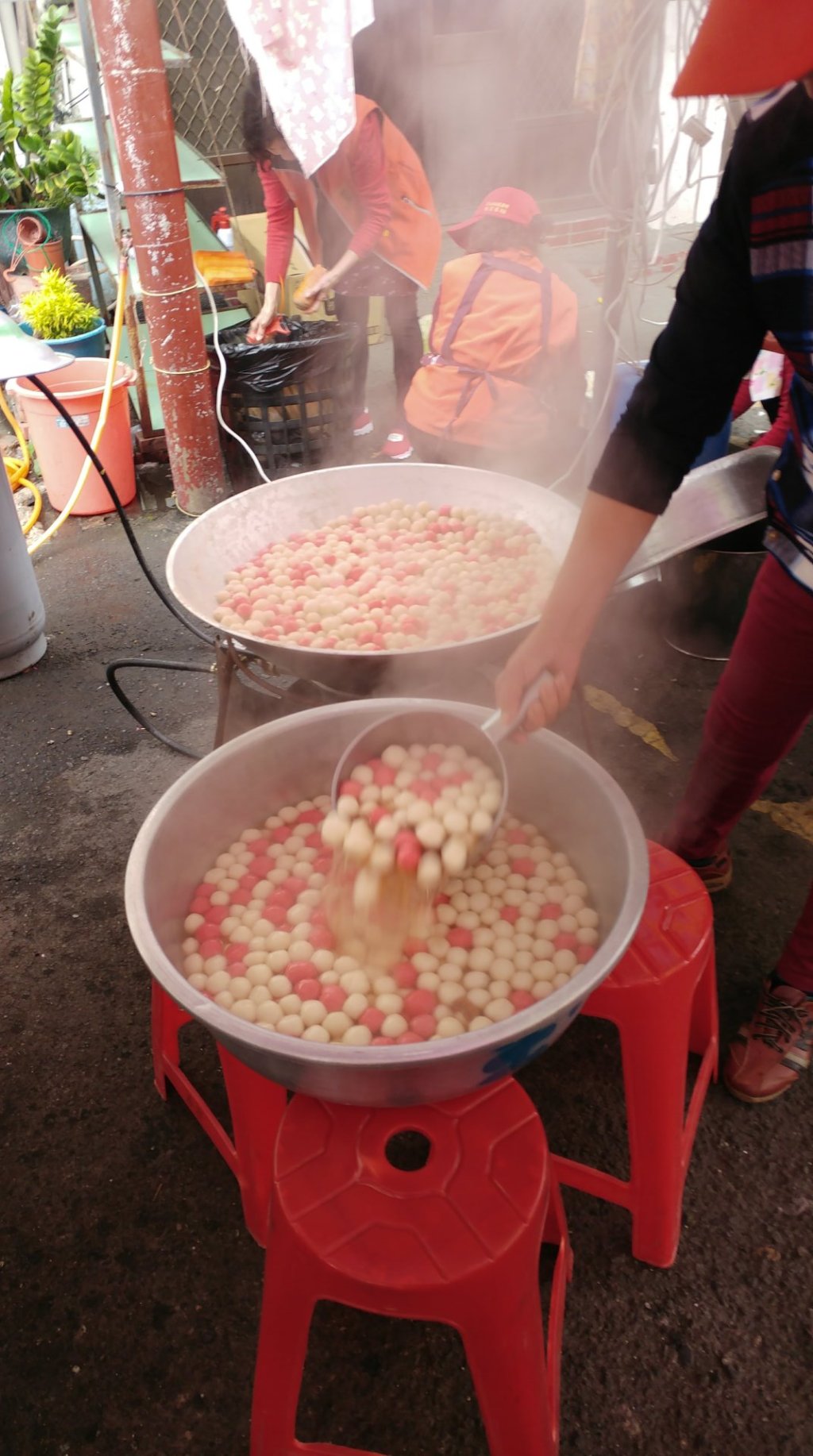 我一早買到米苔目之後,就去廟口幫忙。在幫忙搓湯圓跟紅龜粿時,由於第一批送來的粿粹太過『ㄕㄠˇㄕㄠˇ』,做出來的紅龜粿很容易裂開,婆婆媽媽還要重新搓粿粹。結果跟業者講了之後,第二批就好做太多了!