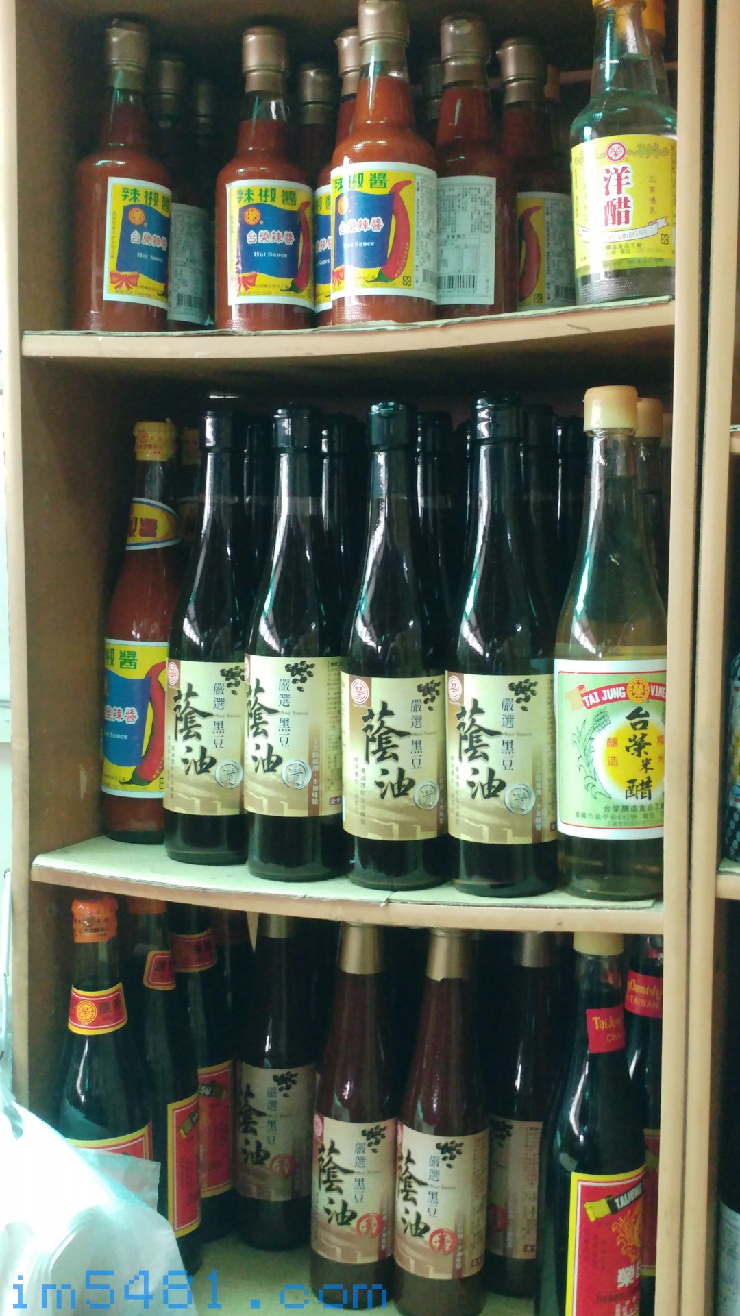 左邊的櫃子: 小瓶辣椒醬、洋醋、大瓶辣椒醬、黑豆蔭油清、台榮米醋、榮印醋、黑豆蔭油膏。