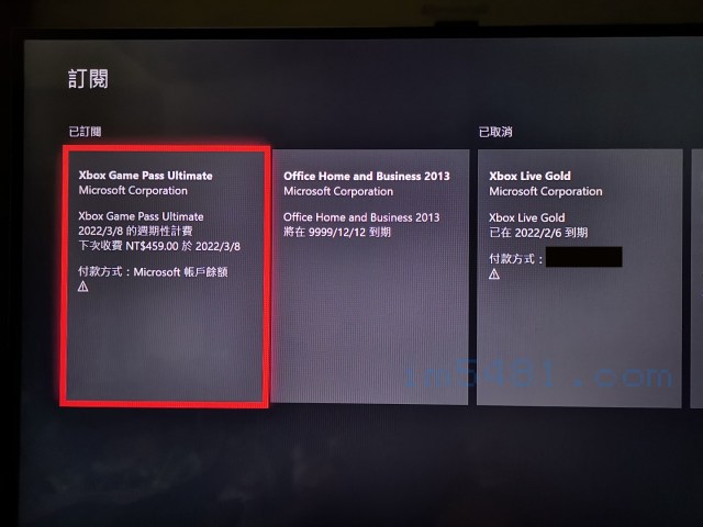 七. 於是再度確認我們Xbox帳號的訂閱資訊。我們可以清楚的看到我們已經升級到 Xbox Game Pass Ultimate ,訂閱期間已經到2022/03/08.