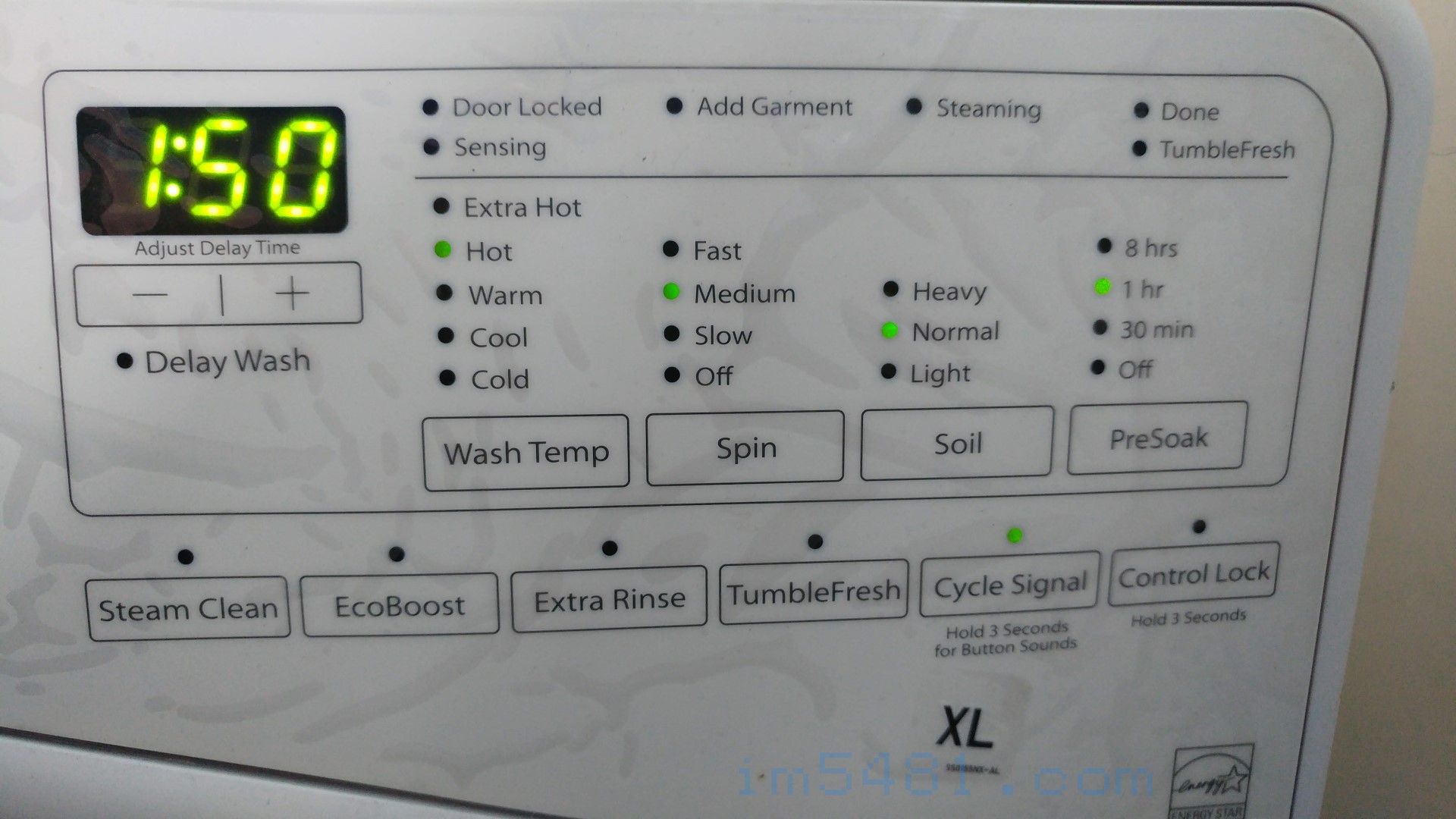 NORMAL 行程,水溫(Wash Temp)為Exter Hot、 脫水轉速(Spin)為Medium 或Fast #1 、衣物髒度(Soil)為Heavy、預先浸泡(Presoak)為8 hr、 Steam Clean 啟動 。