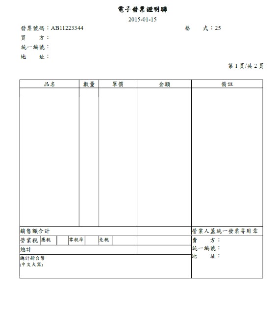 另外如果是營業人對營業人,有時對方會開立成像一張A4紙大小的電子發票證明聯(格式二, 限營業人與營業人、機關團體交易時適用。 寬度:21(±3%)公分 (含左右留白寛度) 長度:29.7(±3%)公分(含上下留白長度) )。這個也是電子發票證明聯,在正式BtoB的交易,已執行電子發票開立作業的公司,都會開立此類電子發票證明聯。有些廠商也可以利用電子郵件寄送電子檔案格式的電子發票證明聯 。