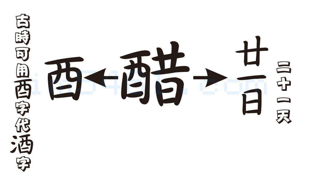 因此醋 既然是由 『酉、廿(卄)、一、日』四個字所組成的,也就是說【用酒發酵二十一天】即可成『醋』。