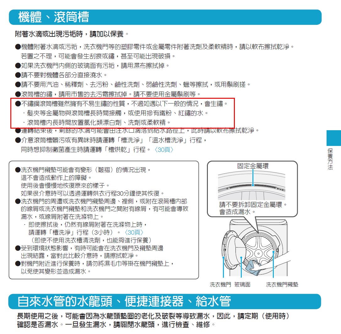 所以你拿起洗衣機說明書,裡面有不少都是勸使用者要注意不要讓洗衣槽殘留漂白劑、洗劑、柔軟精,以免生鏽!