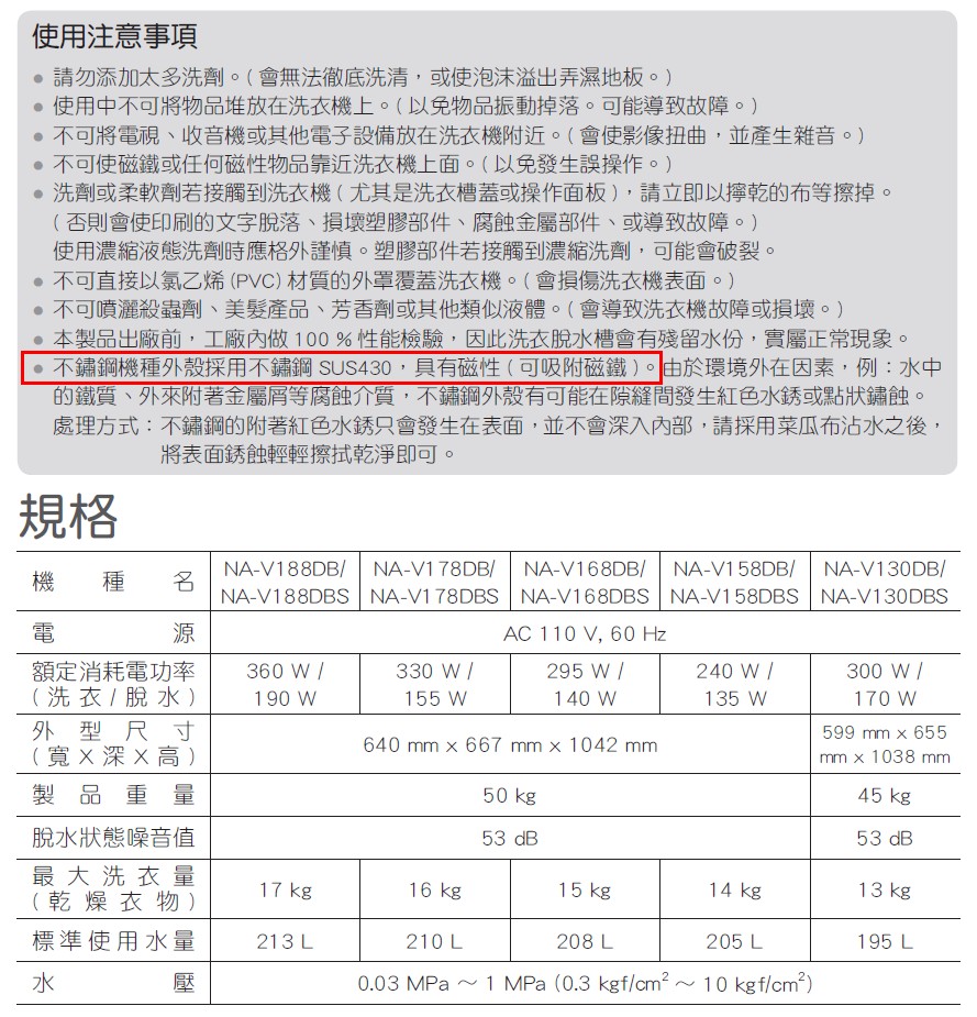 Panasonic洗衣機所使用外殼材質為SUS430,其說明也是會產生鏽蝕。