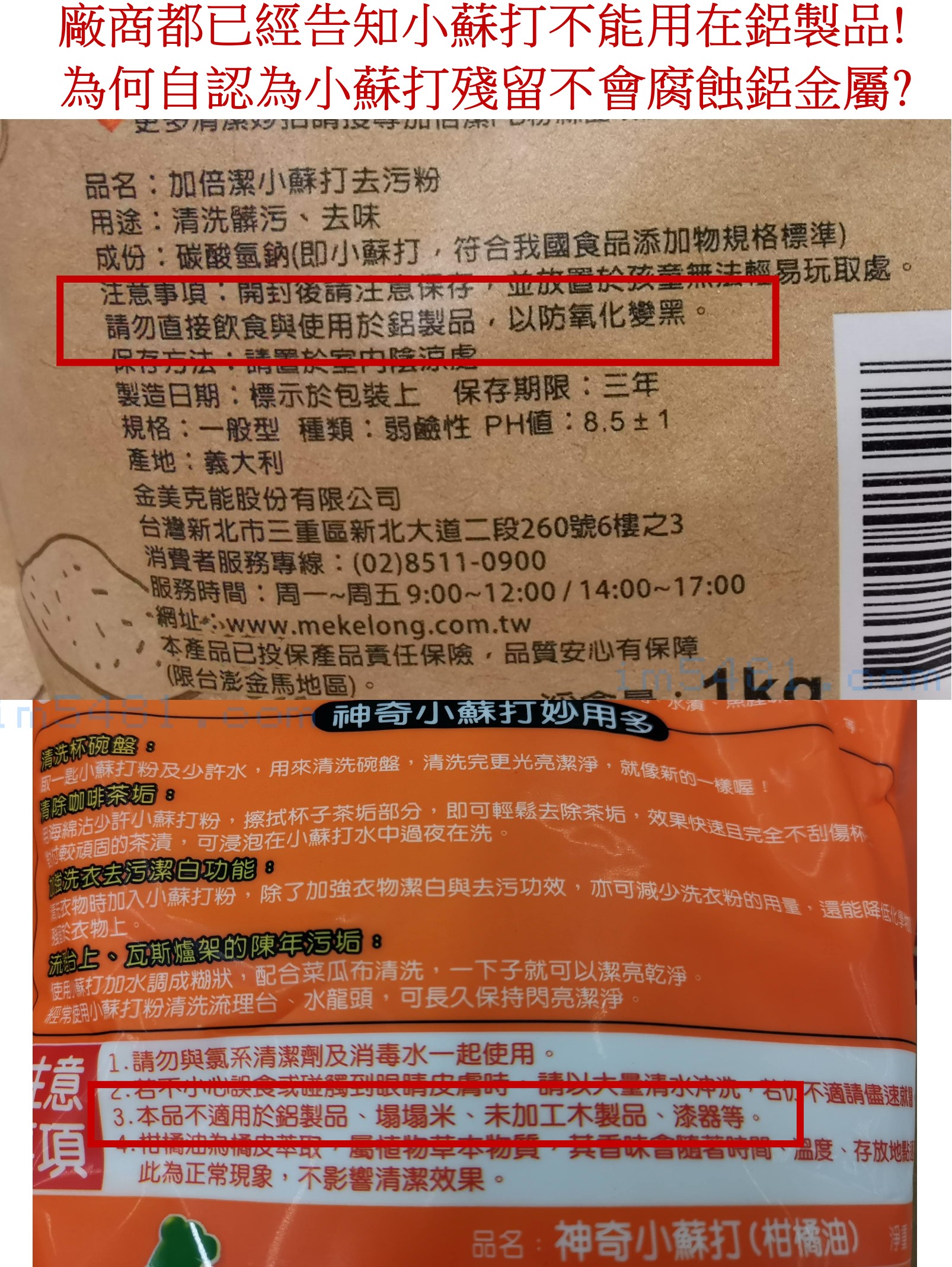 日系生活老媽小蘇打粉清潔劑的注意事項: 『請勿用於鋁製品,否則會使其氧化變黑』 、 『 本產品請勿用於鋁製品上使用,鋁製品會氧化變黑 』 。