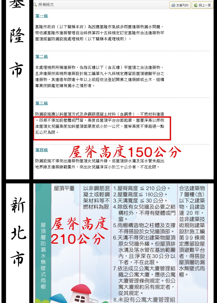 基隆市所設定的合法屋脊高度只有150公分以及屋簷高度只有100公分,其只會嚴重妨礙消防逃生! 而且根本不會防雨! 連清掃都是要蹲下腰來用爬的!