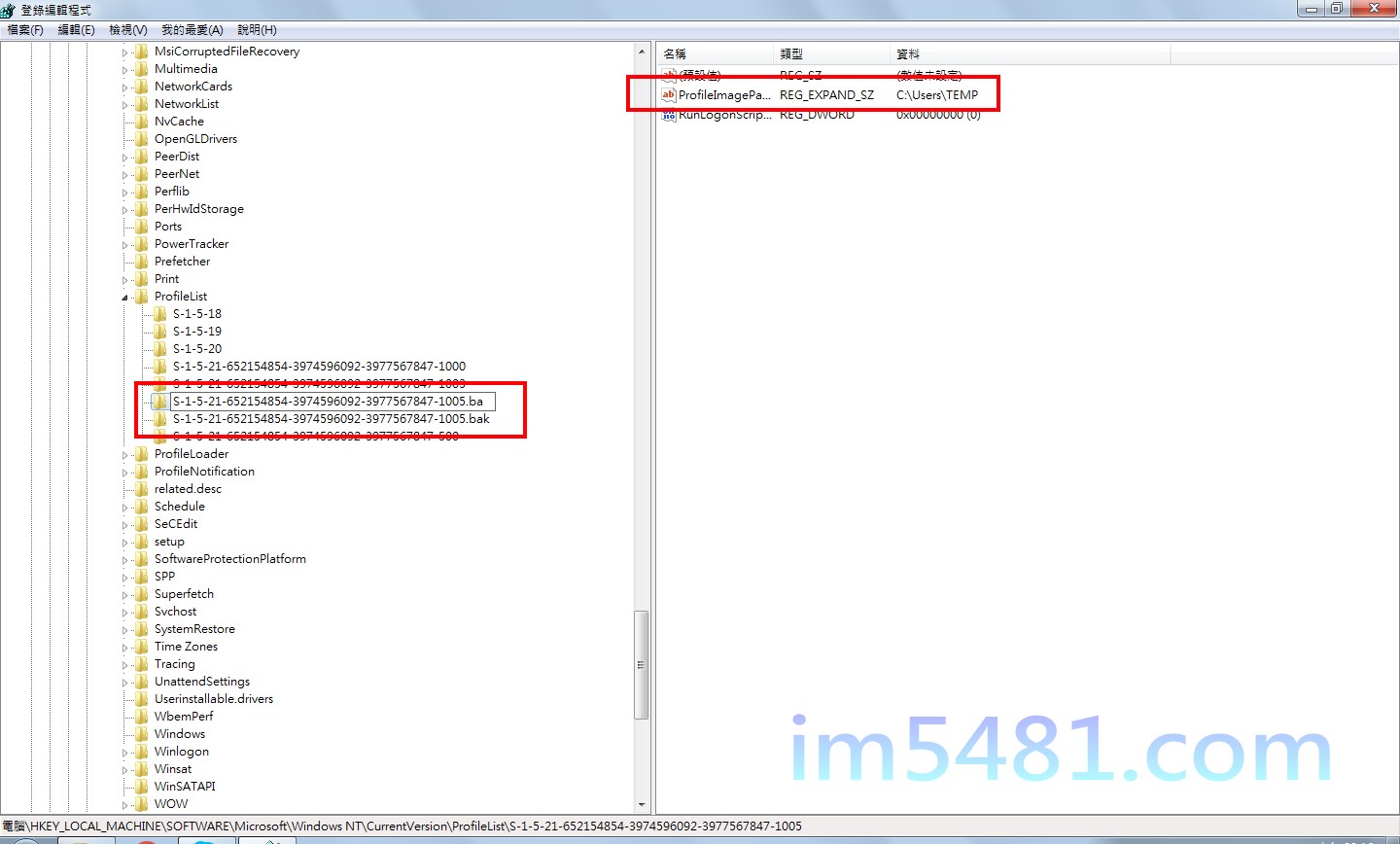 - 按一下每個 S-1-5 資料夾,在 [詳細資料] 窗格中找出 ProfileImagePath 項目,然後按兩下以確認這就是發生錯誤的使用者帳戶設定檔。