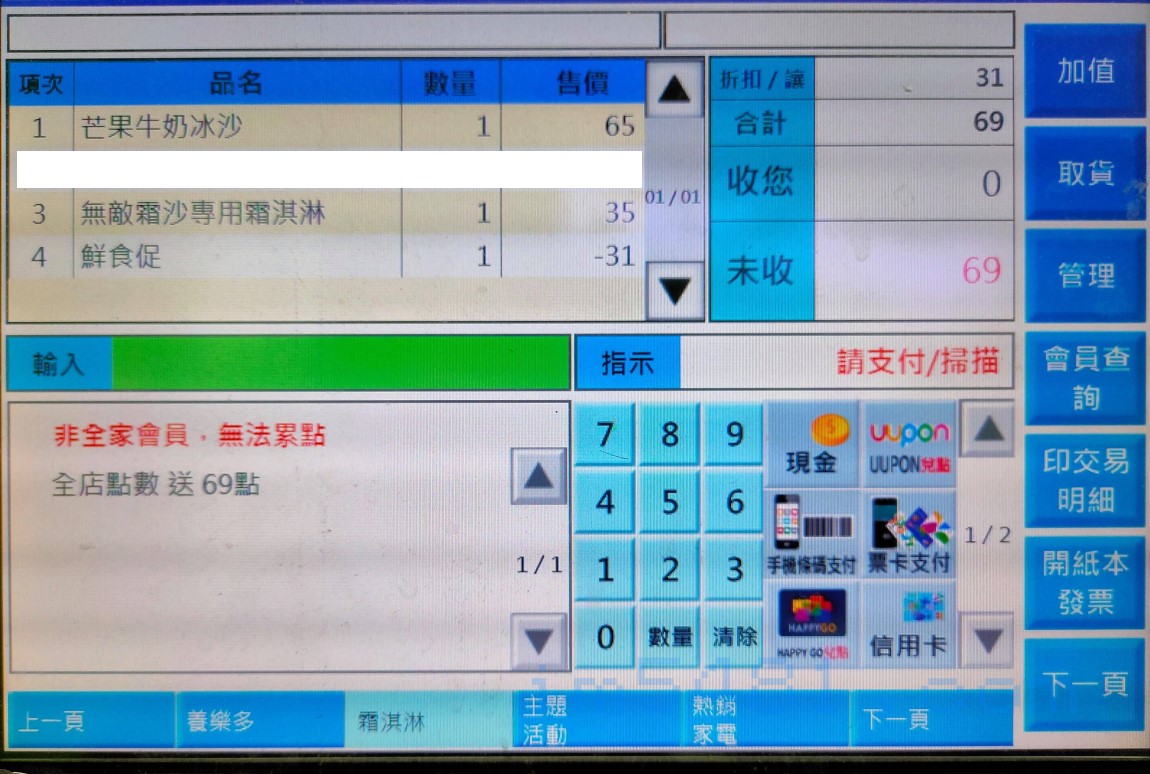 全家店員必須先在POS機按了『酷繽沙的種類』,然後再選『無敵霜沙專用霜淇淋』,這才會變成『無敵霜沙』,並且啟動特價! 從原本的35元+65元=100元,特價變成69元。