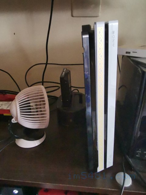 六. 將PS4 PRO主機安裝鎖上直立架,我是用原廠的PS4 PRO直立架,鎖好之後,就可以將原本下蓋最熱的地方做【公開裸露】,並且可以透過使用風扇(我是使用USB供電的風扇)讓其發熱溫度大幅降低,其也會大幅降低暴力扇高速運轉的機會。