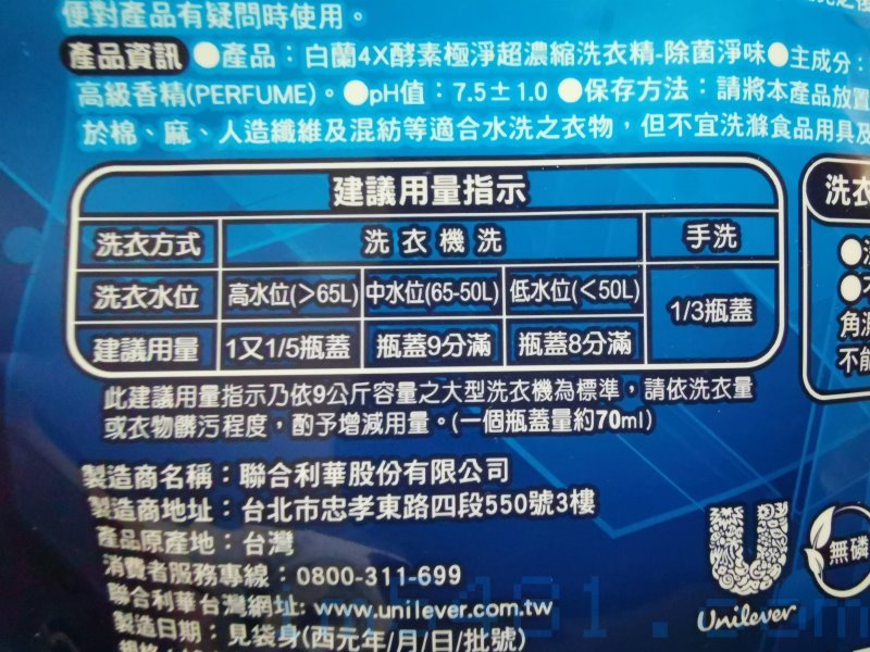 因為我個人的經驗是,白蘭的建議用量都有過度誇大,其都是【建議的洗衣劑用量太少】,或【可用的衣物量過多】。也就是其標示的可洗衣物沒有那麼多! 而且幾乎有50%的跨張差異!