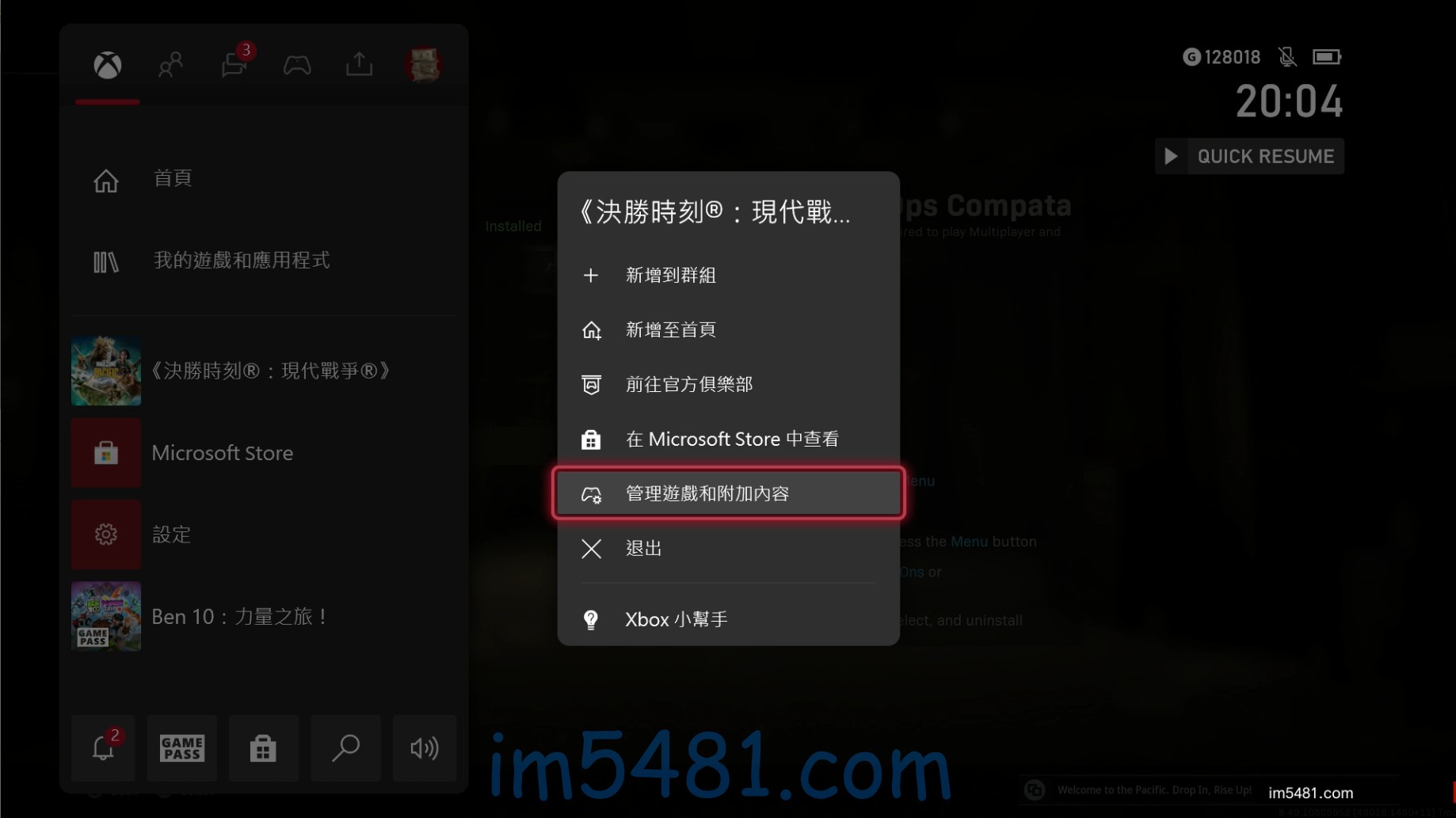 7. 在選擇Call of Duty: Modern Warfare (決勝時刻®: 現代戰爭®)的狀態下,按下Menu button ㊂, 並且選擇Manage Game & Add-Ons(管理遊戲和附加內容)