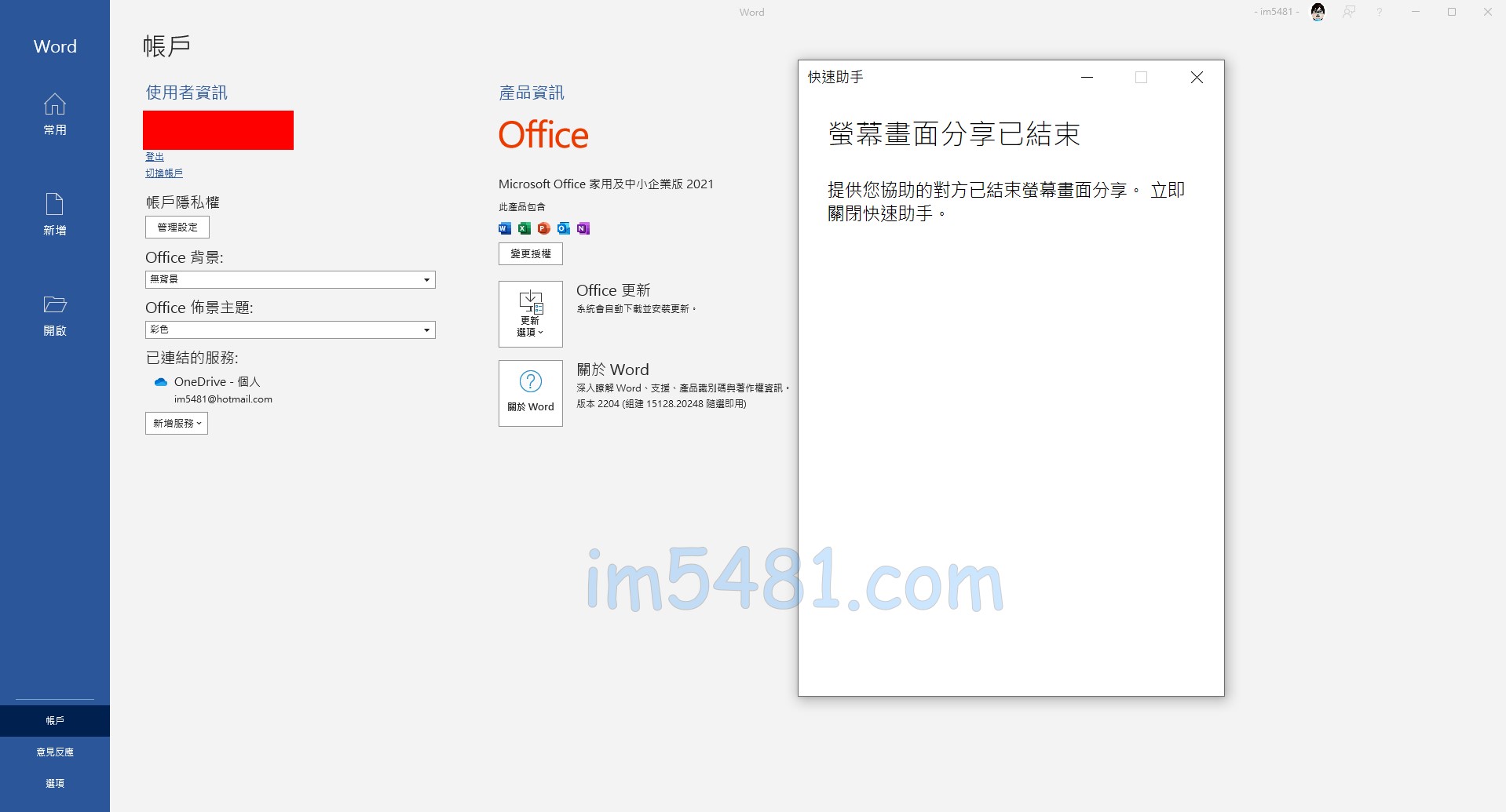 允許遠端遙控後,其就直接進入我的Office 2021,登出所有Microsoft 帳號,並重新選擇我無法啟動授權『Office 2021 家用及中小企業版』版本,其一樣會出提示【此產品已安裝在其他裝置上】,並且要求我聯絡微軟客服中心 的畫面,但這時有聽到上海微軟工程師在操作該公司系統的鍵盤輸入聲,然後就看到他把我Office 2021關閉、重啟,重新登入我的Microsoft 帳號(Office授權帳號),其就可以正常選擇並啟動我那原本無法授權啟動的Office 2021 家用及中小企業版了!