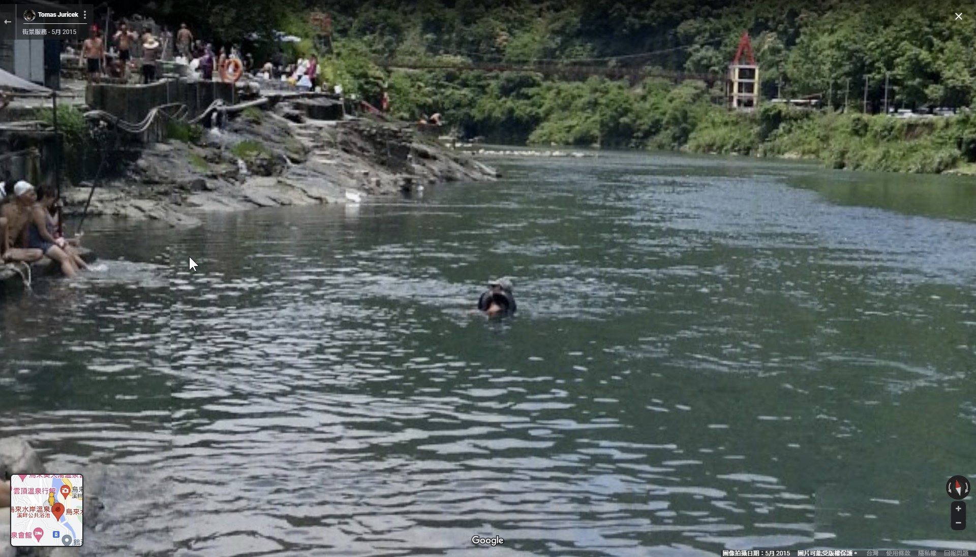 我下水之前還特別問了哪邊的溪流較危險? 我這個初學者必須要避開? 各位大哥大姐都叫我靠岸邊游就好了,不要到溪水中央,也不要在溪流很強的時候下水。然後一位大哥就指著一位正在游溪流中央的好手,其努力向上游,但我這邊看起來就像是緩慢往上游動,可見溪水的強勁。